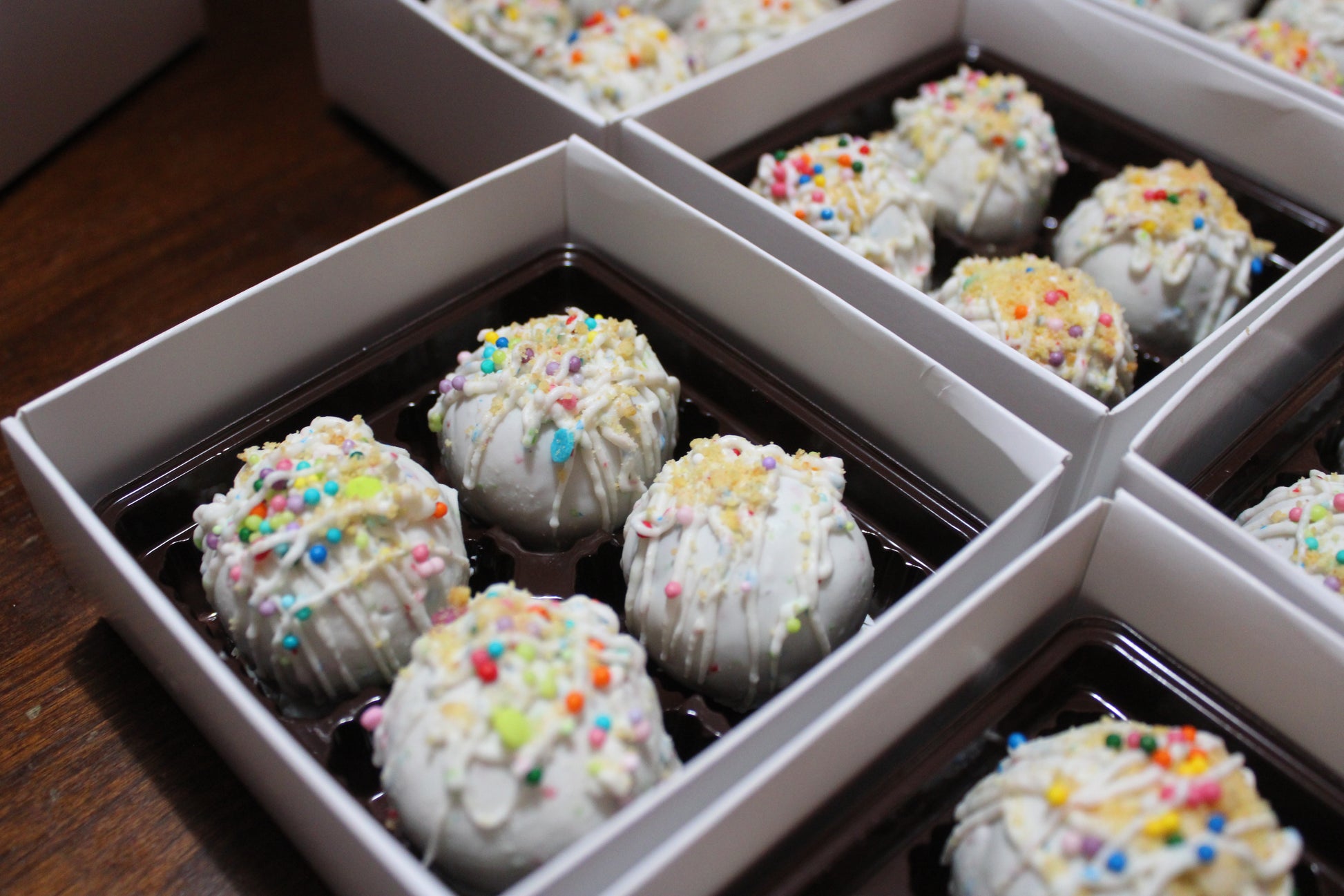 Vanilla Cake Bon is a yummy treat! Made with moist vanilla cake- mixed with creamy frosting, confetti sprinkles- dipped in confetti candy melts- topped with crushed homemade vanilla cookies